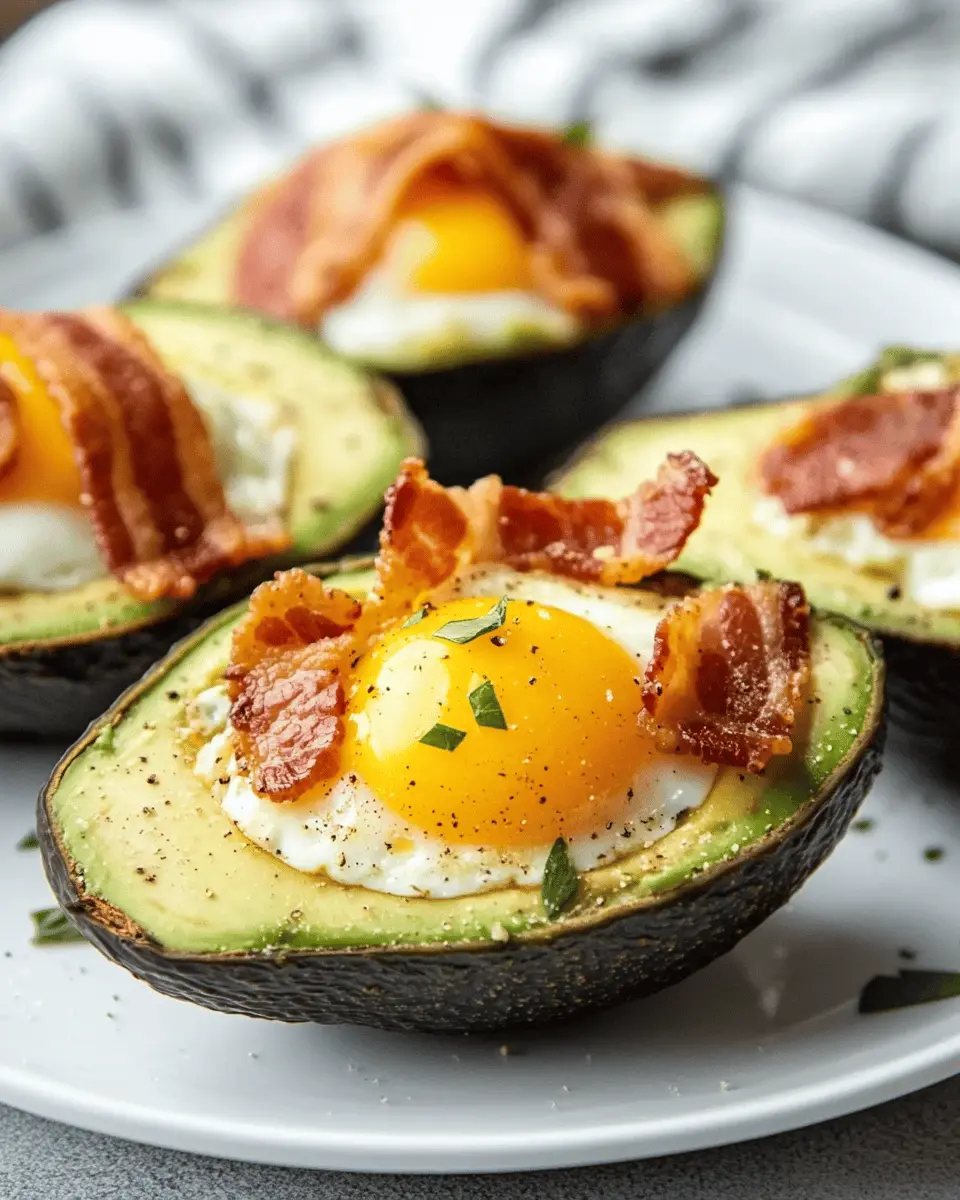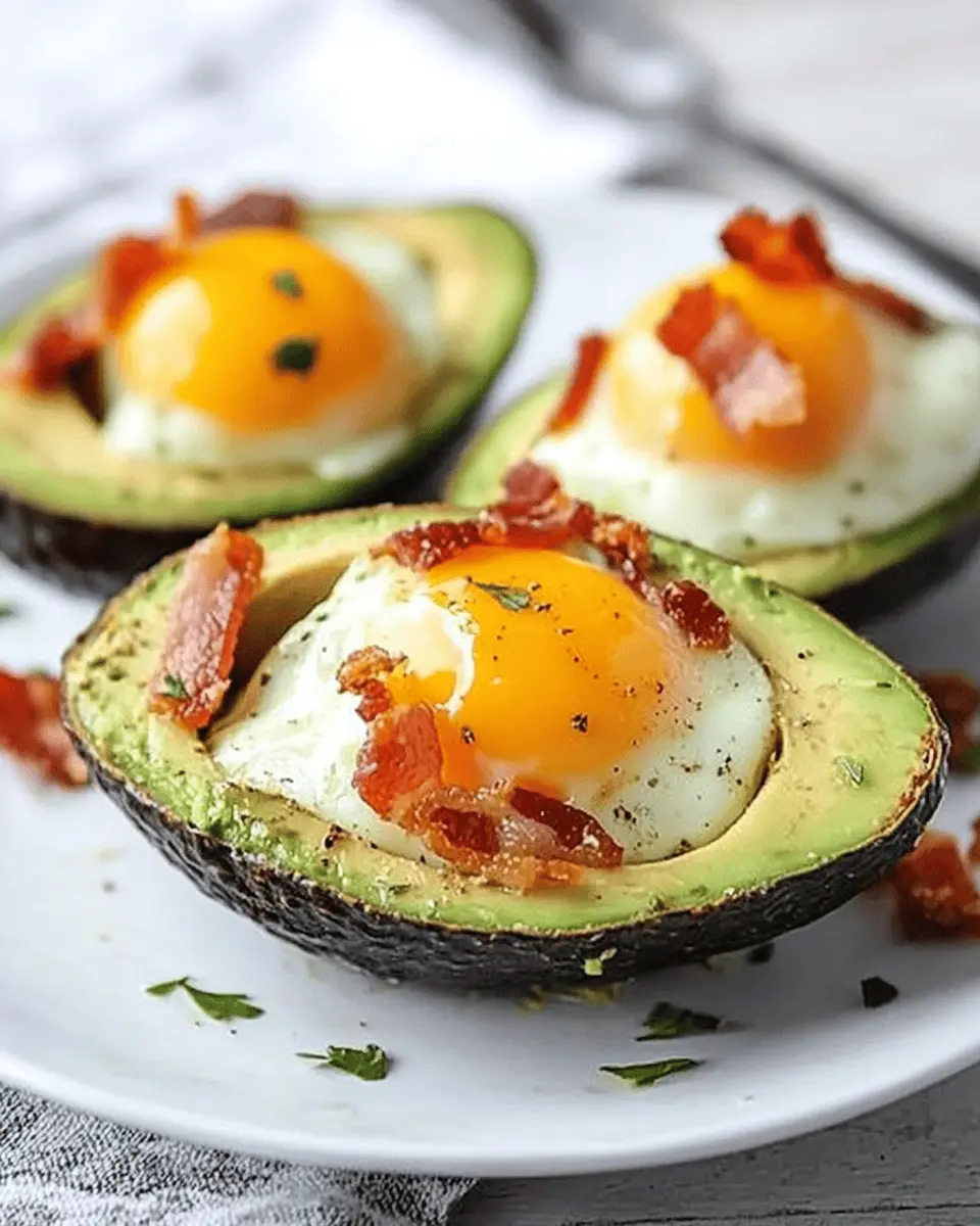 Delicious baked avocado eggs topped with crispy bacon – a perfect breakfast or brunch option!