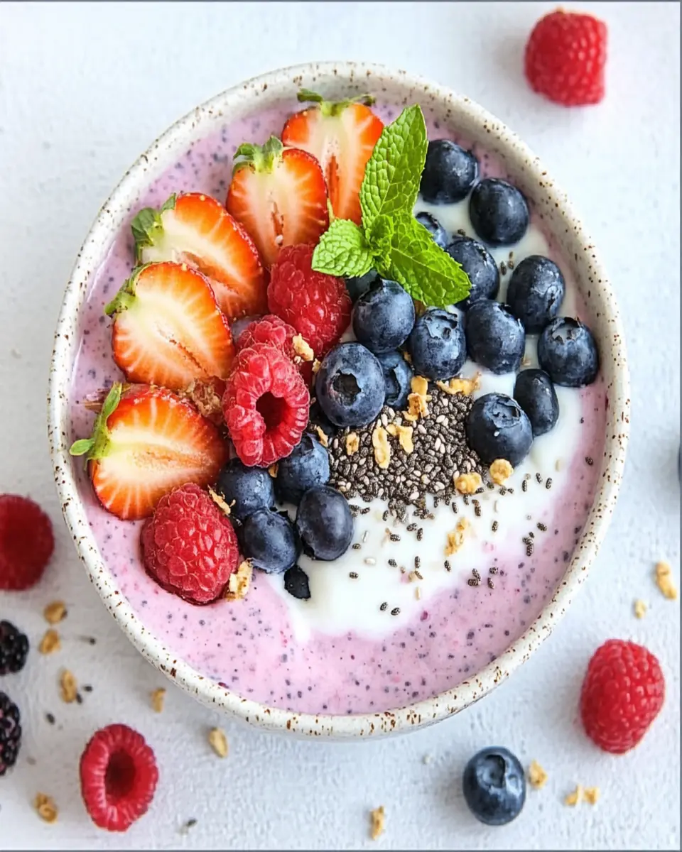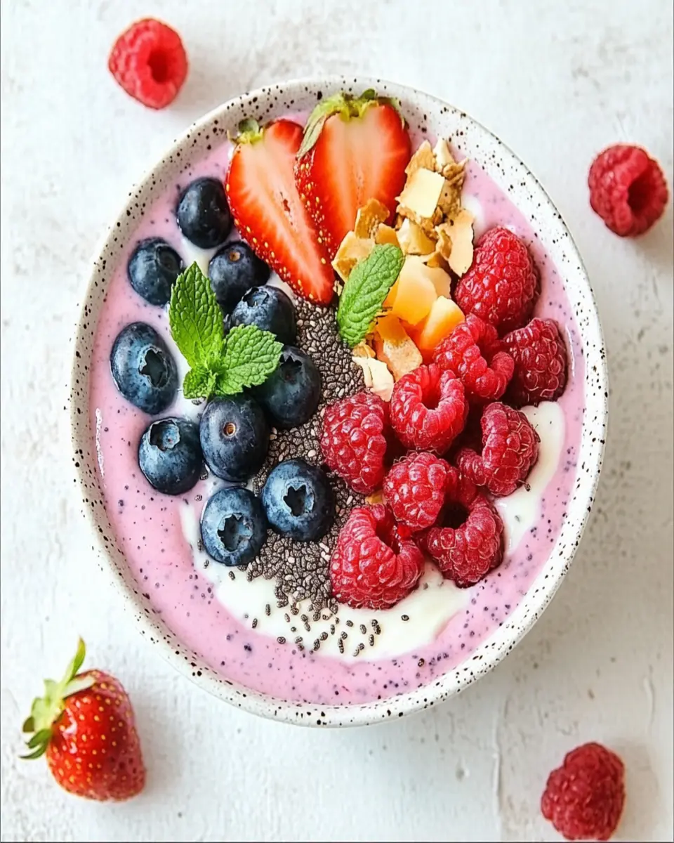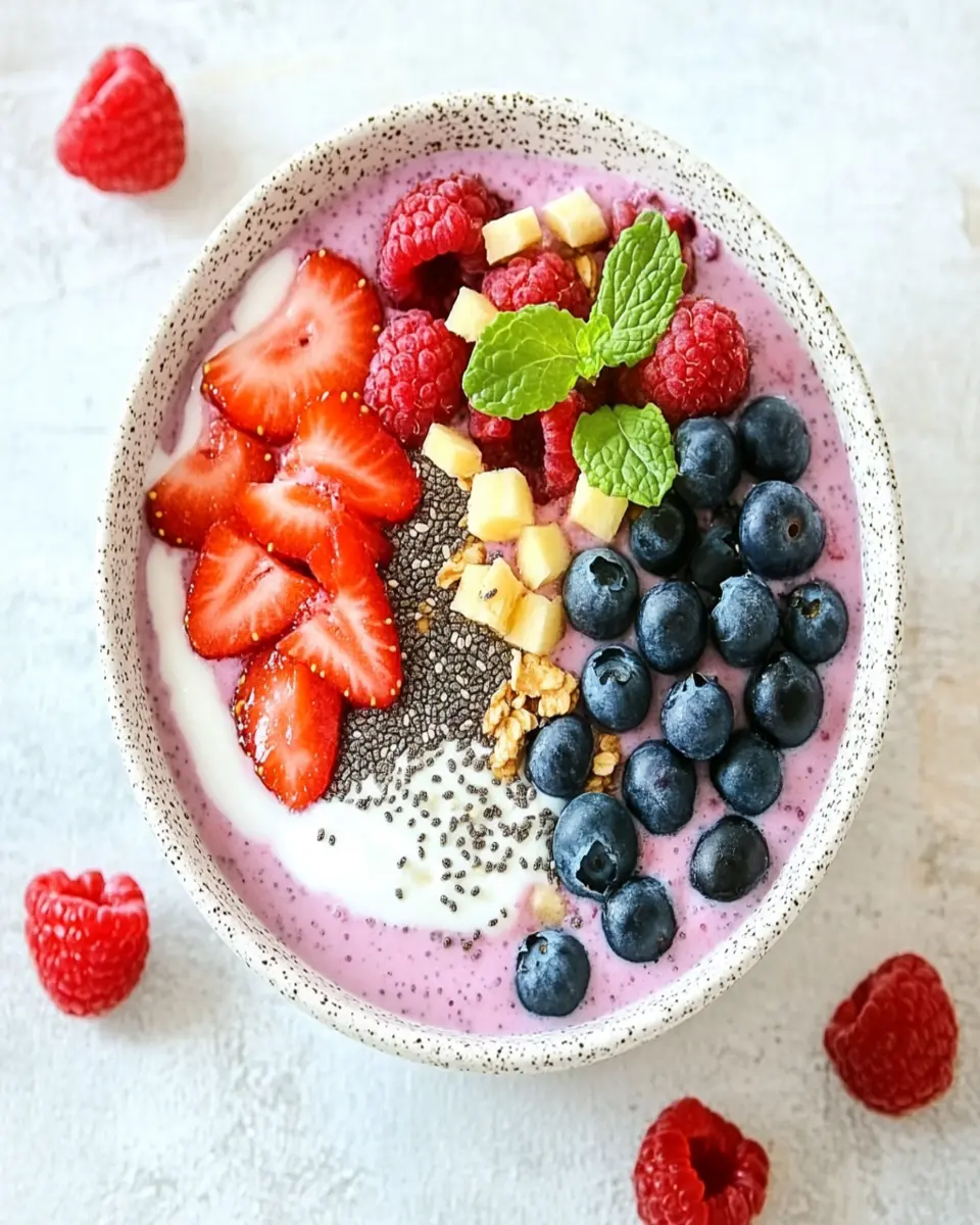 A colorful mix of strawberries, blueberries, and raspberries brings vibrant flavors and antioxidants to the dish. These berries are not only delicious but also packed with vitamins that contribute to overall health and wellness.