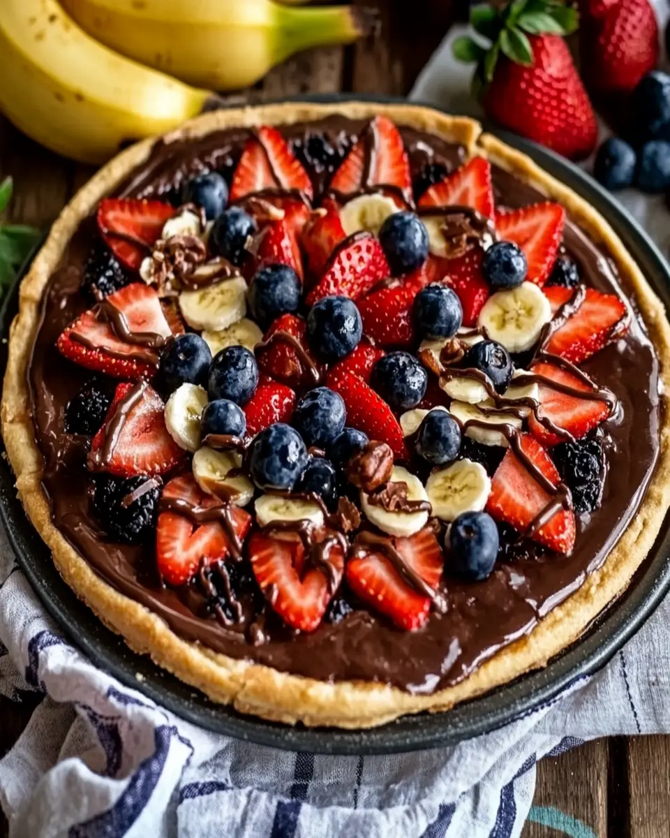 A delicious dessert pizza topped with creamy chocolate hazelnut spread, fresh fruits, and a drizzle of chocolate sauce.