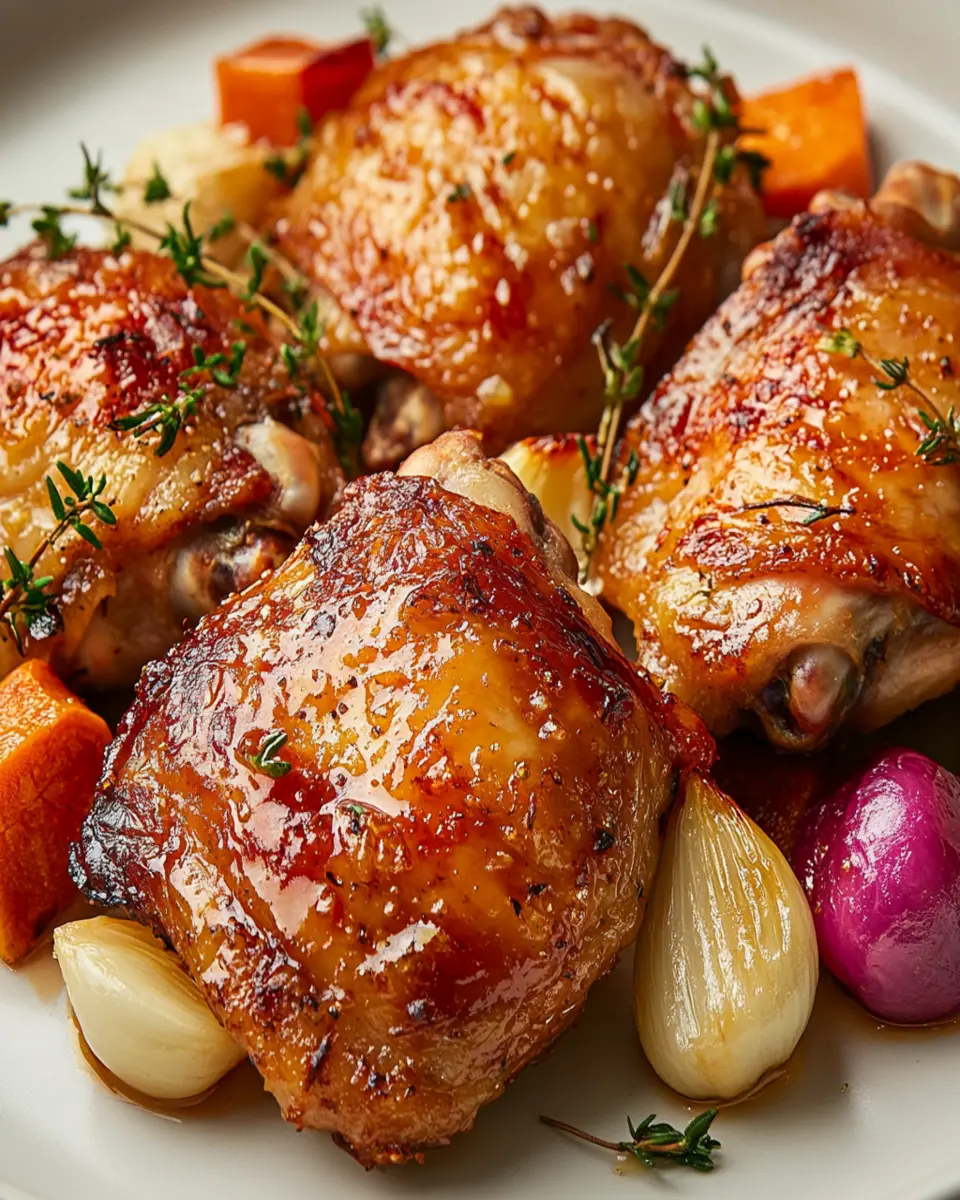 Confit garlic refers to garlic cloves that have been slowly cooked in oil until they become soft, sweet, and buttery. This cooking method enhances the garlic’s flavor, making it a perfect ingredient for dishes like Confit Garlic & Thyme Roasted Chicken Thighs, where the creamy texture and rich taste elevate the overall dish.