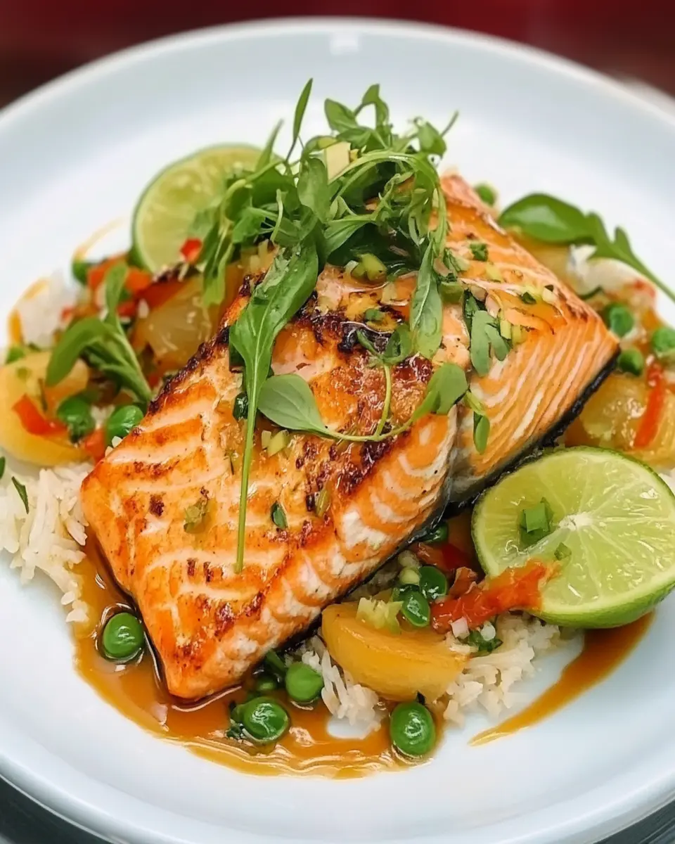 Fresh lemongrass and basil are the stars of this dish, infusing the salmon with aromatic notes that transport your taste buds straight to the bustling markets of Thailand. The lemongrass offers a citrusy zing, while the basil adds a fragrant sweetness, creating a perfect balance that elevates the rich flavor of the salmon fillets. In just 30 minutes, you can serve this delightful meal that pairs wonderfully with steamed rice or a fresh salad.