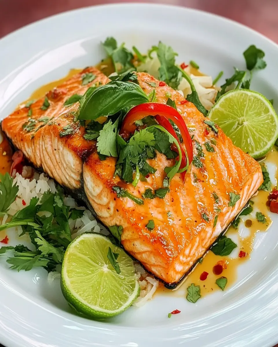 For added flair, garnish your salmon with extra fresh basil or thinly sliced lime. These finishing touches not only make for an appealing presentation but also enhance the dish’s flavor profile. Enjoy your meal with a glass of chilled white wine or sparkling water with a slice of lime for a refreshing drink that pairs perfectly with the flavors in your dish.