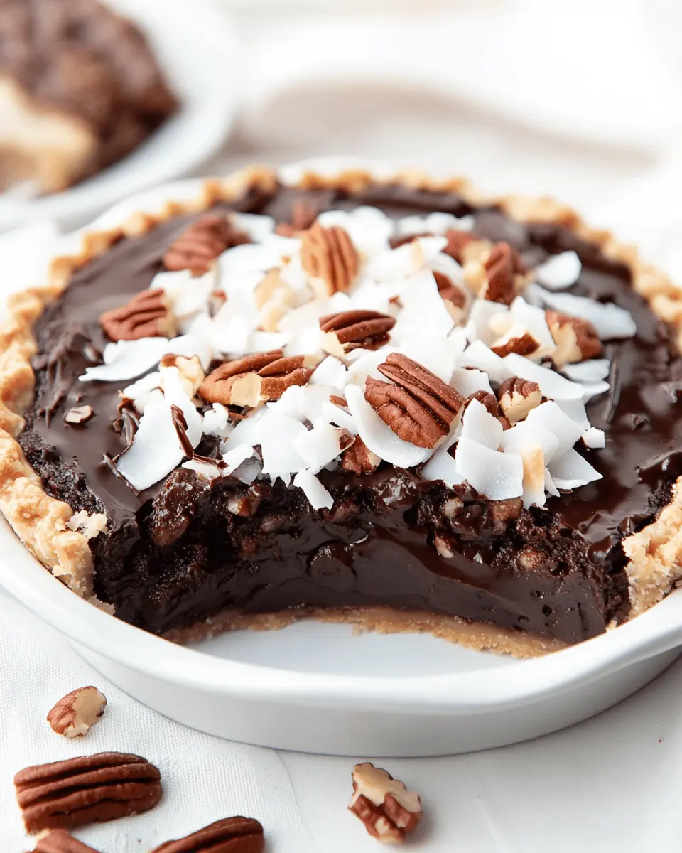 A delicious German Chocolate Pie made with chocolate, coconut, and pecans.
