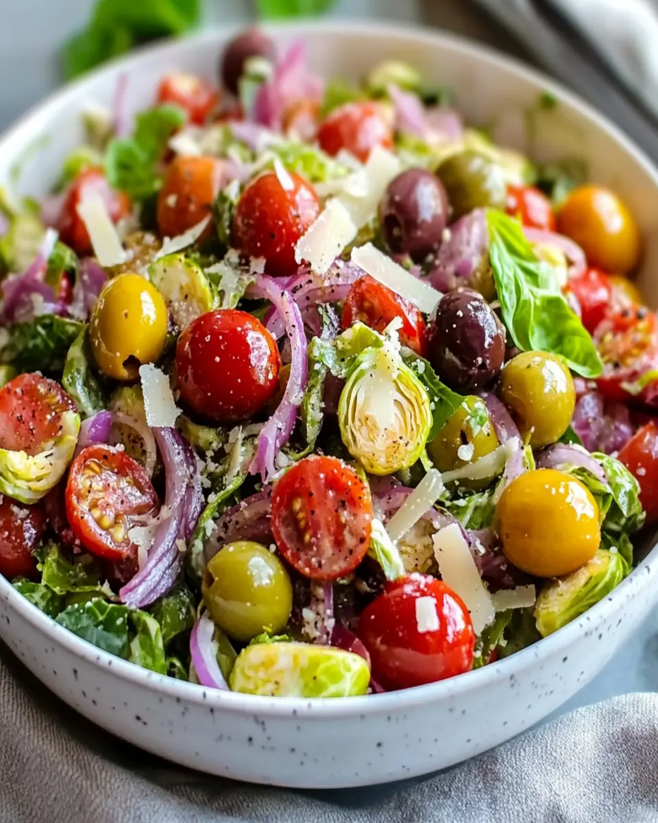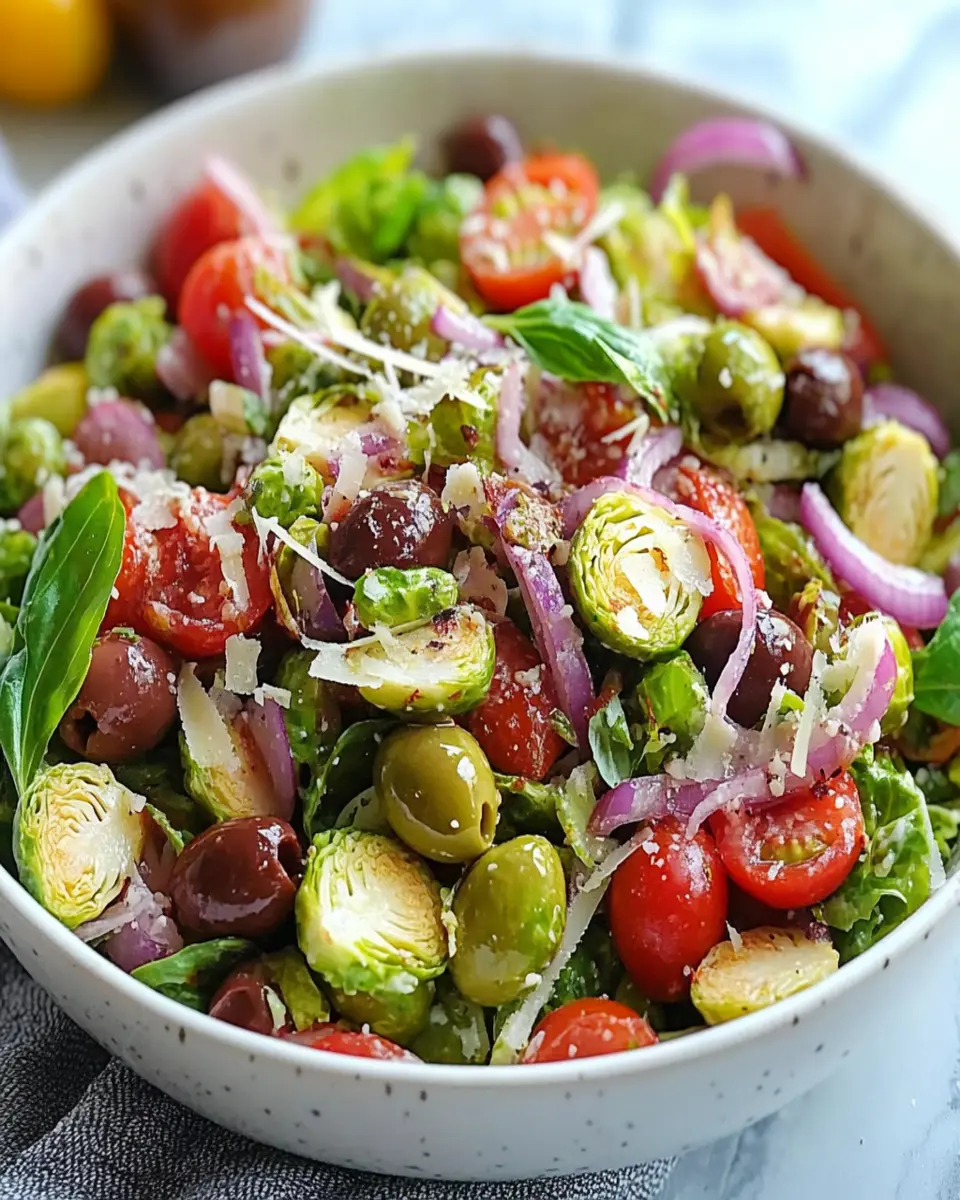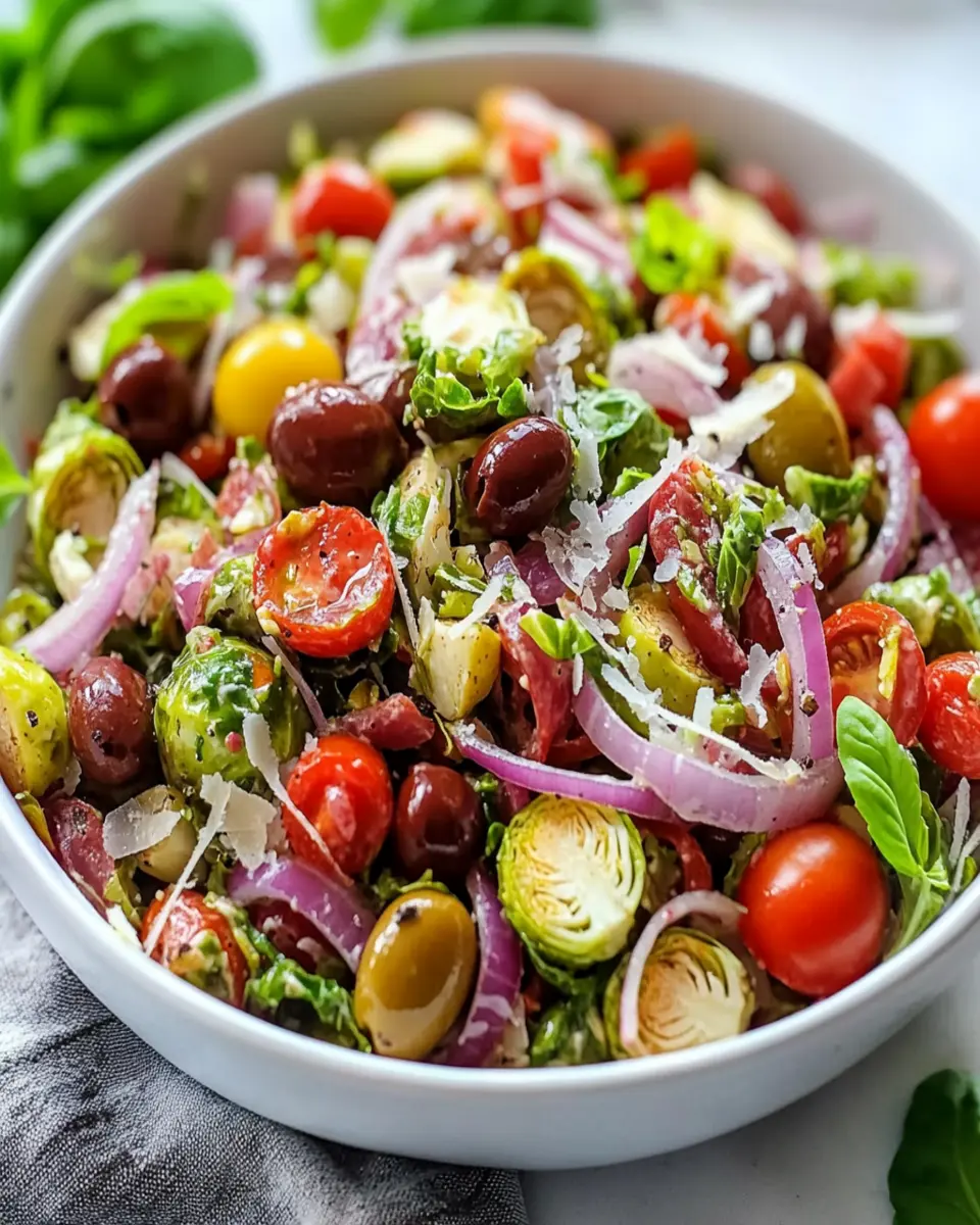 A fresh and vibrant Italian Antipasto Brussels Sprouts Salad featuring a combination of roasted Brussels sprouts, olives, peppers, and cheeses.