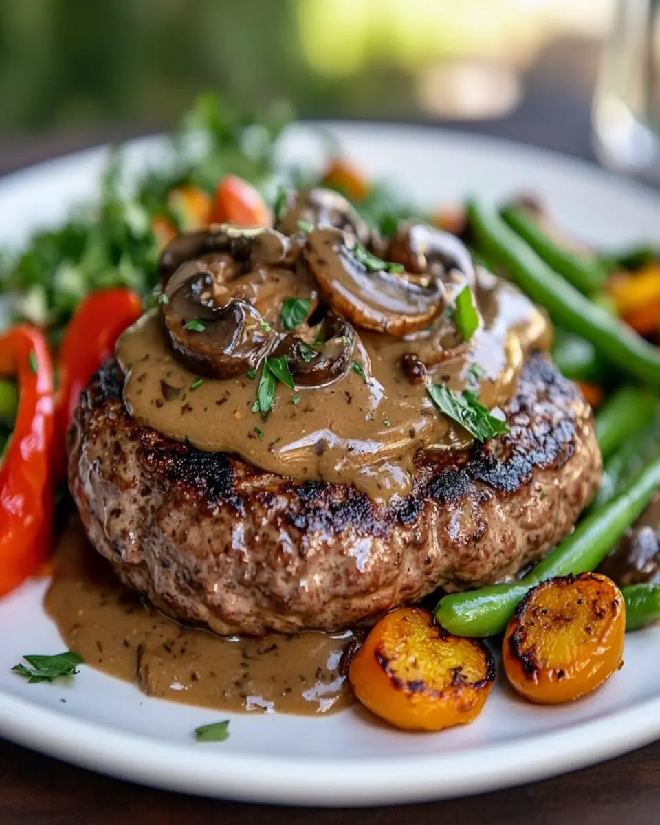 A delicious keto-friendly burger steak served with rich mushroom gravy.