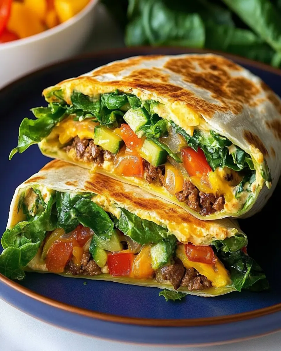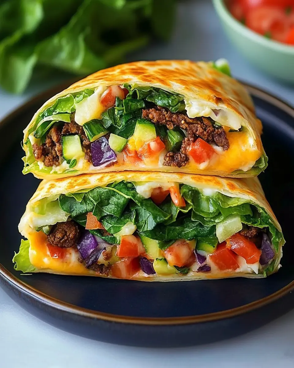 Rich in flavor and protein, the cooked ground beef serves as the hearty filling that makes this wrap satisfying and filling, perfect for a quick meal.