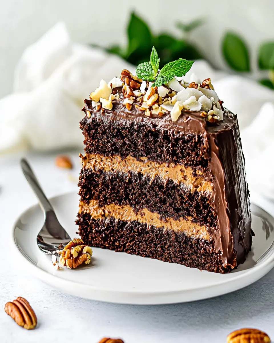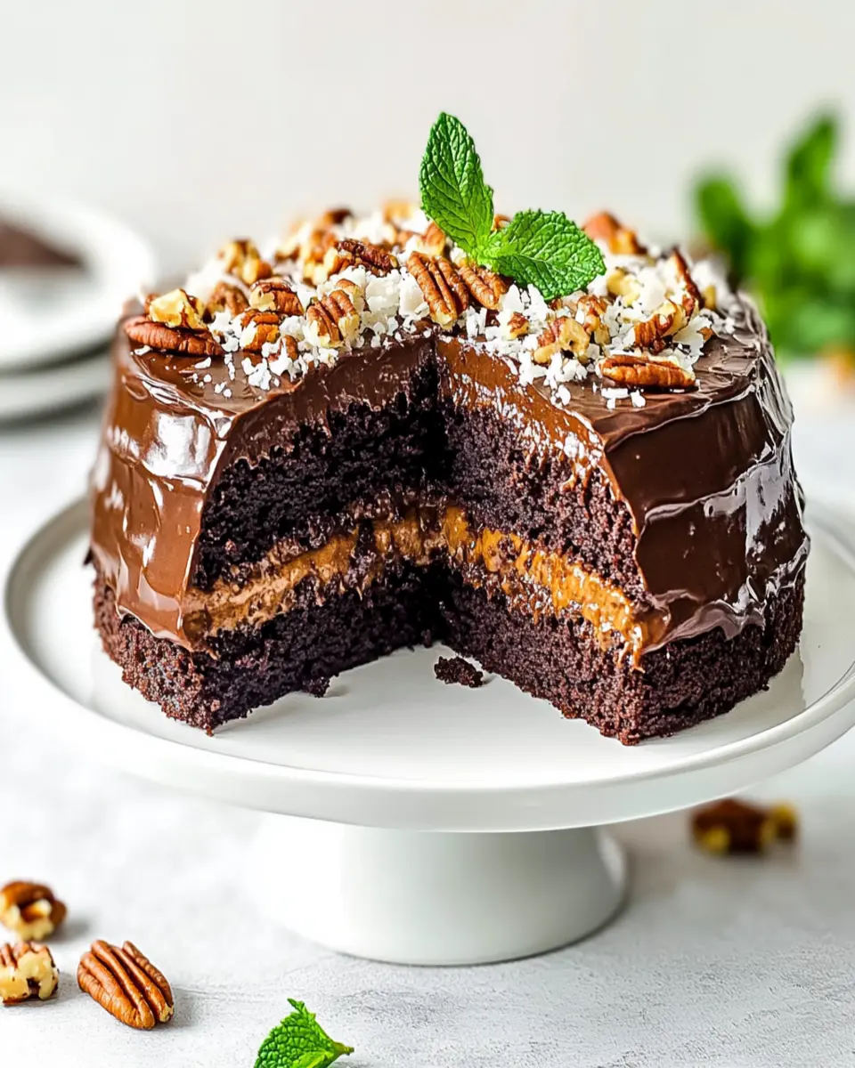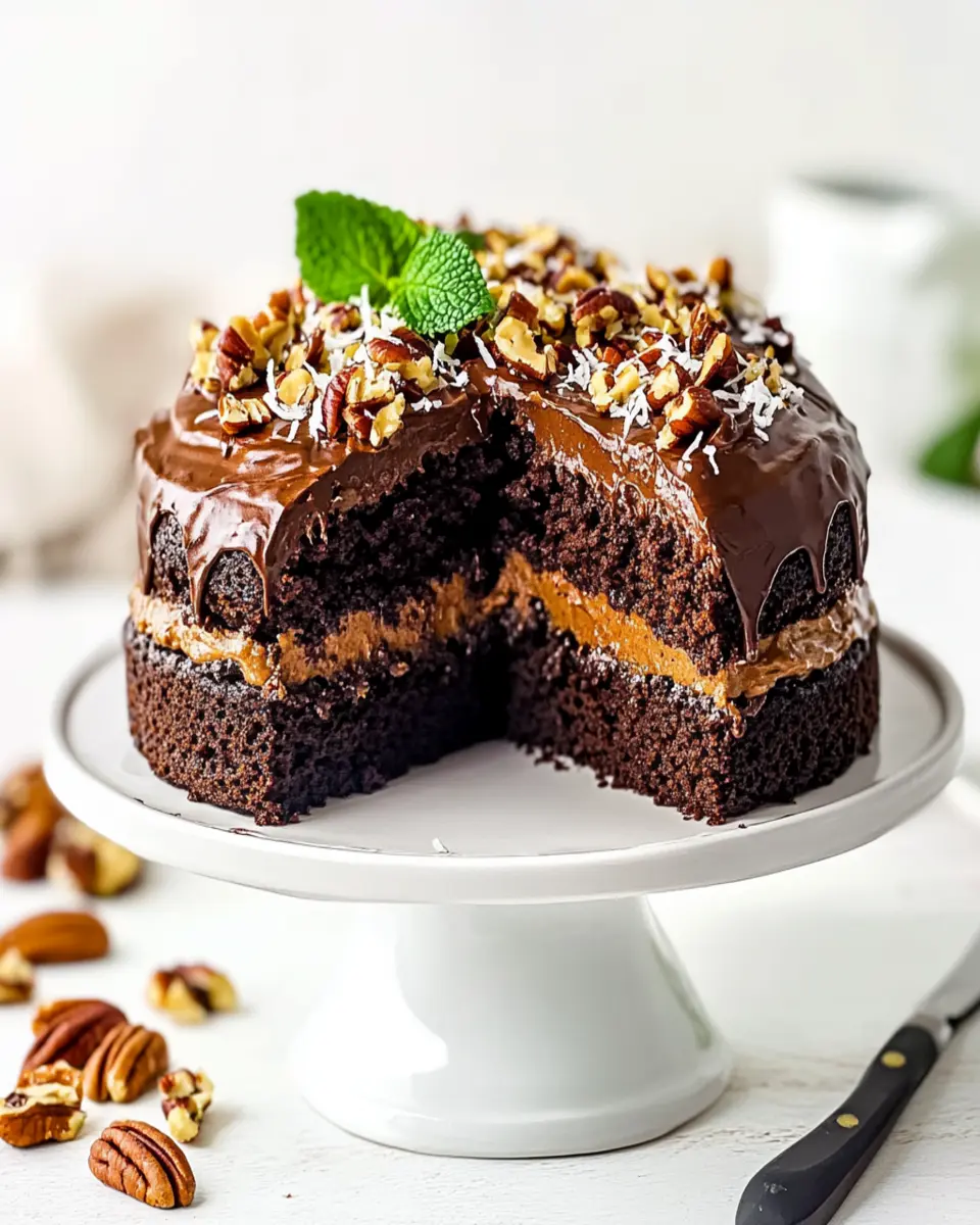 A delightful and rich chocolate cake with a keto twist, topped with a creamy coconut and pecan frosting.