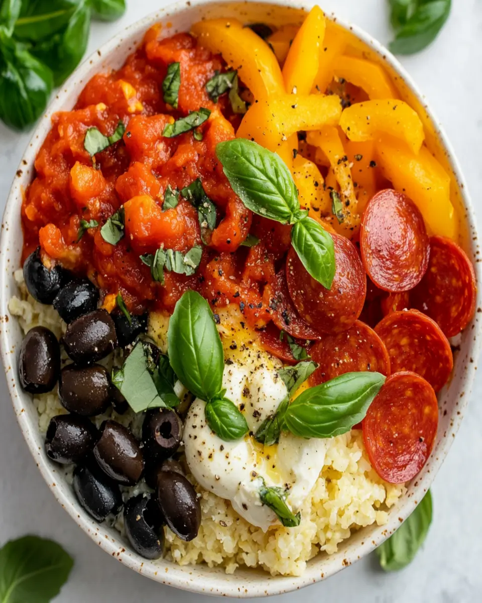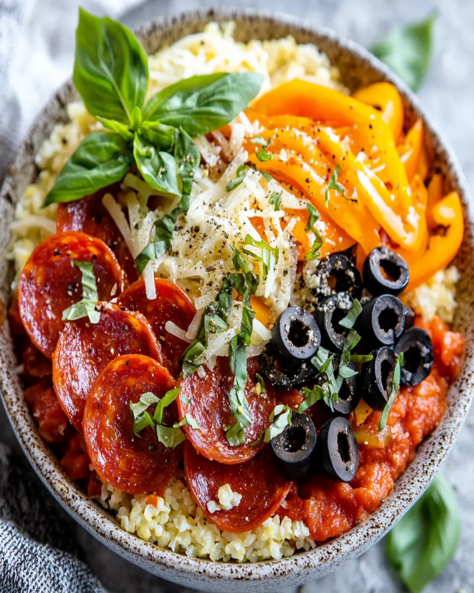 A delicious and satisfying keto pizza bowl that captures all the flavors of a classic pizza without the carbs.