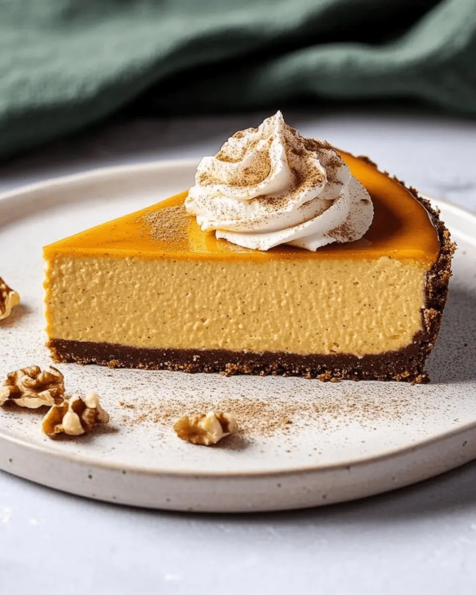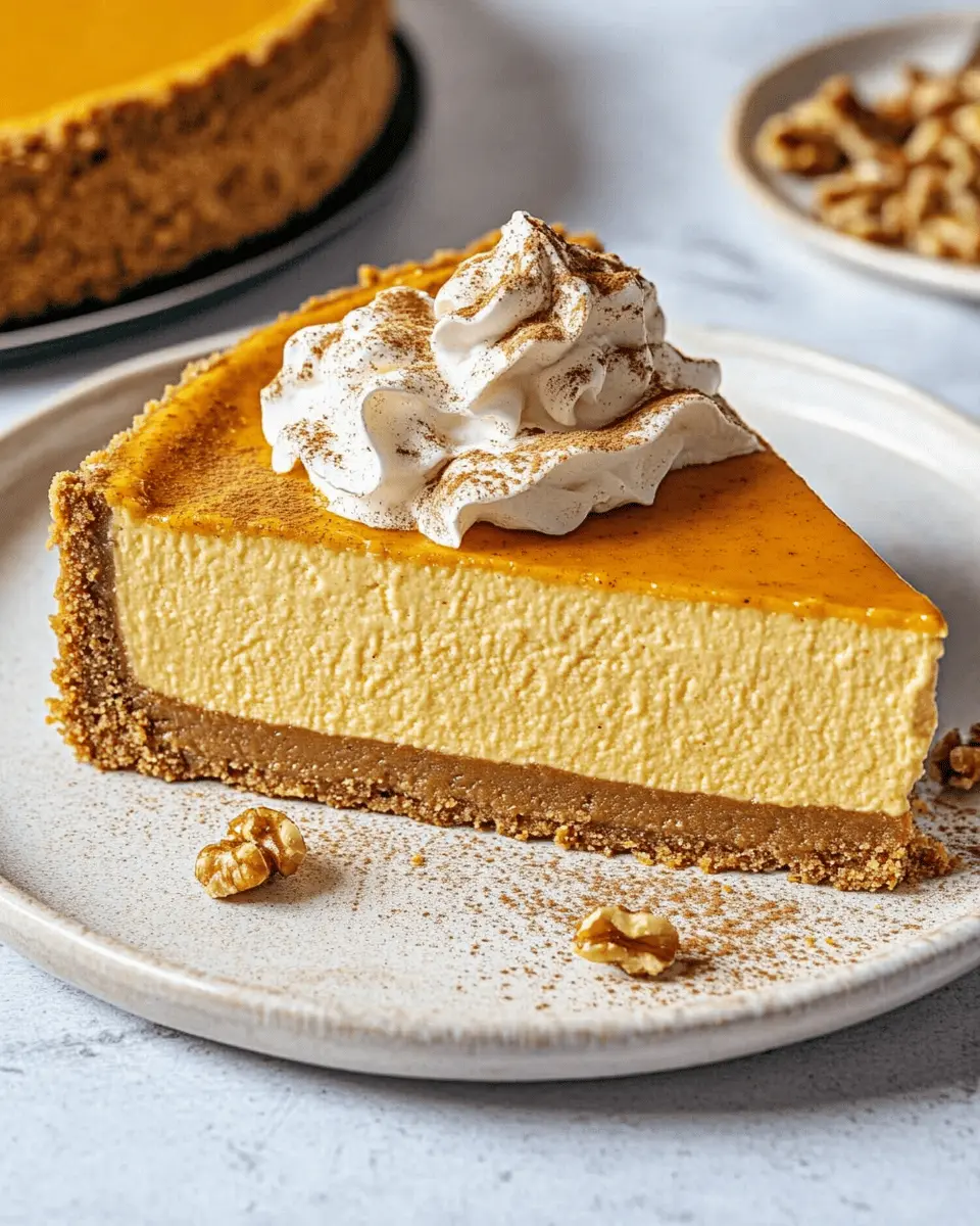 For a festive touch, consider garnishing each slice with a sprinkle of cinnamon or nutmeg. This not only adds to the visual appeal but also enhances the warm spices already present in the cheesecake. Crushed pecans or walnuts can also provide a satisfying crunch and a nutty flavor that pairs perfectly with the creamy filling.