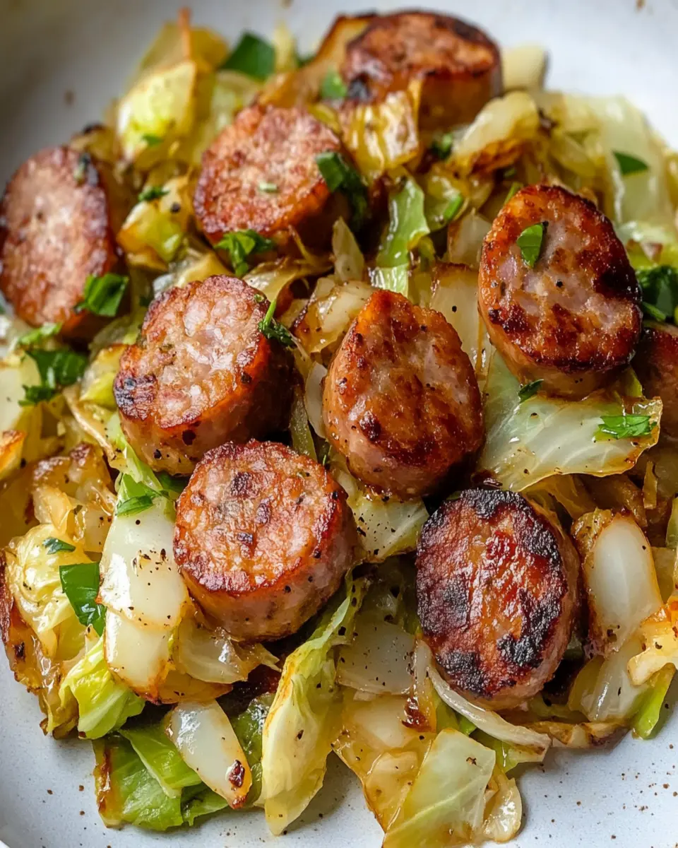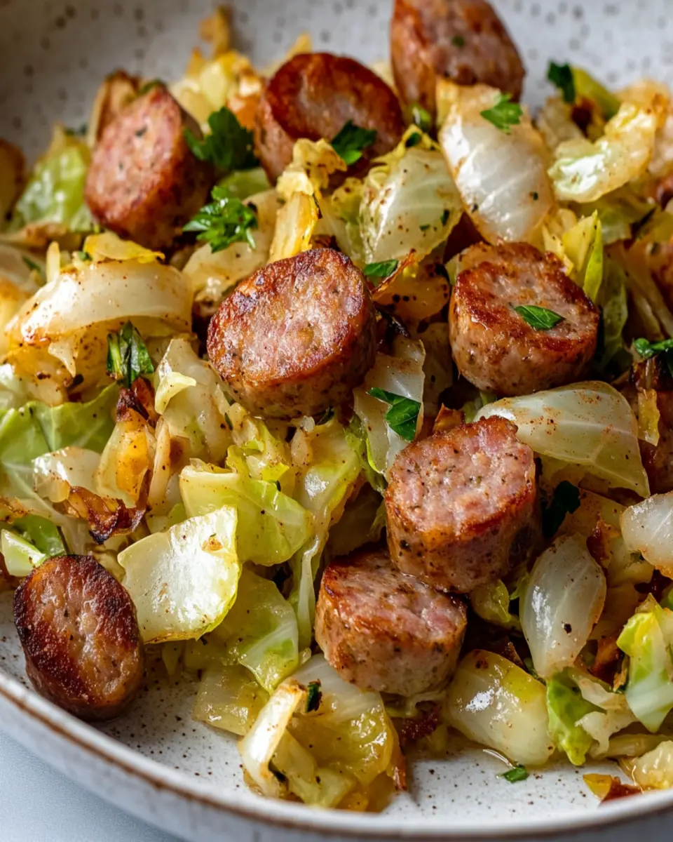 A low-carb, hearty breakfast dish made with sausage, cabbage, and eggs.