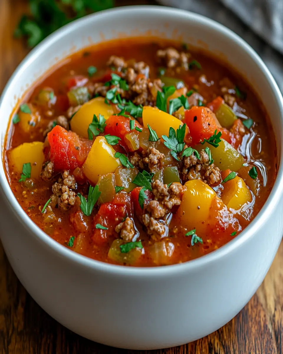 In conclusion, Keto Stuffed Pepper Soup is not just a comforting meal but also a fantastic way to stay on track with your low-carb lifestyle. This delicious recipe combines the rich flavors of traditional stuffed peppers into a hearty soup that is both satisfying and nutritious. With its easy preparation and versatile ingredients, it’s perfect for young professionals and homemade-food lovers alike. Whether enjoyed fresh or as meal prep for the week, this soup is sure to become a staple in your kitchen. So why wait? Cook, save, and share this delightful recipe with friends and family!