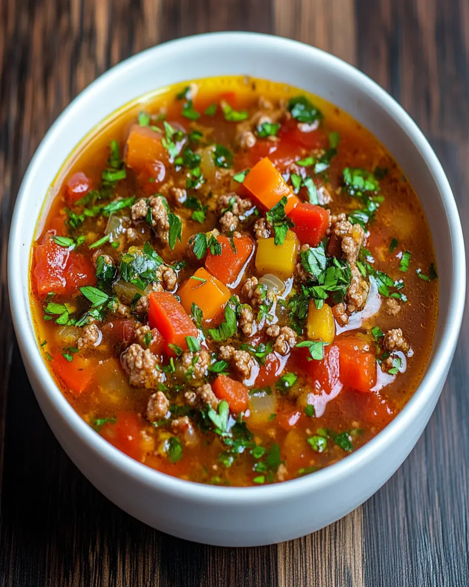 Imagine walking in after a long day, the aroma of beef and bell peppers greeting you at the door. Not only does this soup warm your heart, but it also nourishes your body with wholesome ingredients. With ground beef providing a robust flavor and cauliflower rice acting as a fantastic low-carb substitute, this soup allows you to enjoy a classic dish without the guilt.