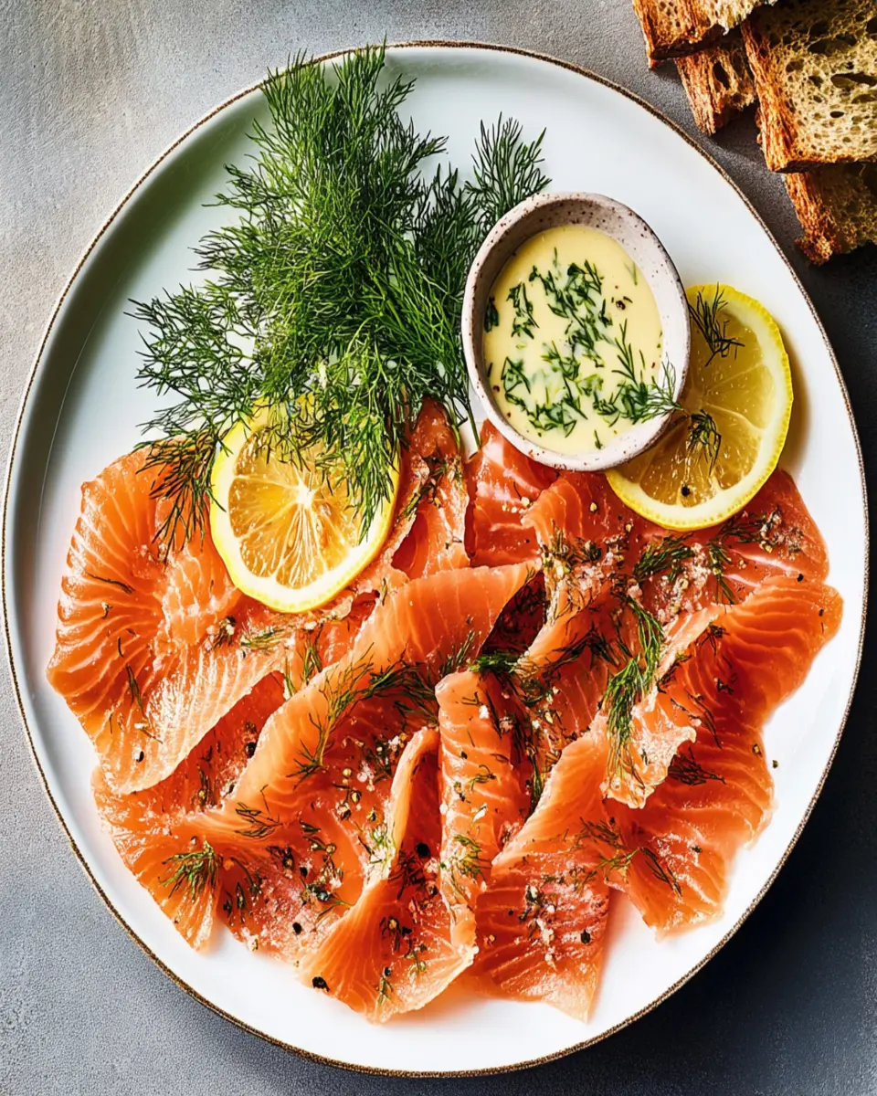 A traditional Scandinavian cured salmon dish, flavored with lemon and dill.