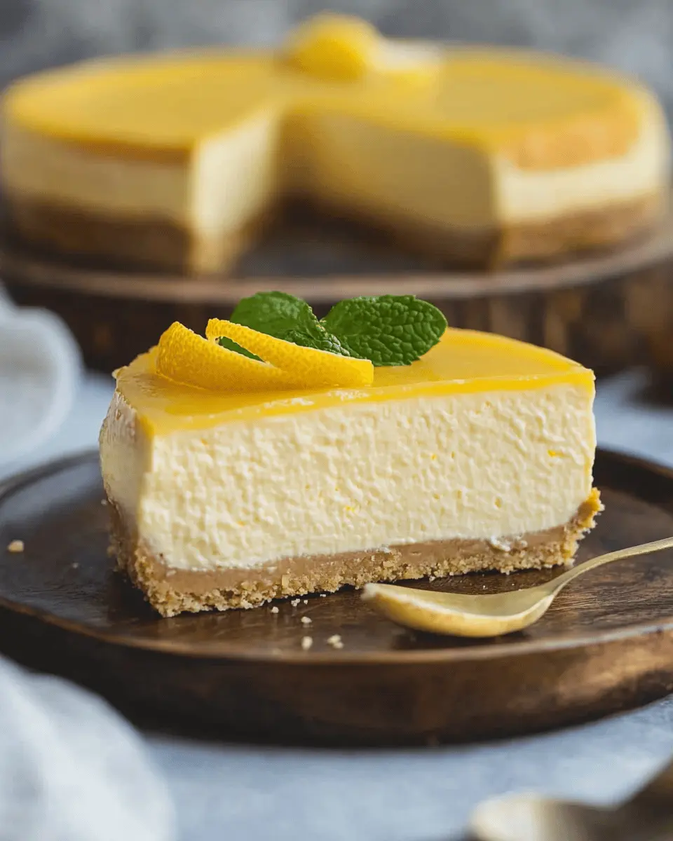 Fresh lemon juice and zest infuse the cheesecake with a bright, citrusy flavor that elevates the dessert, making it refreshing and light.