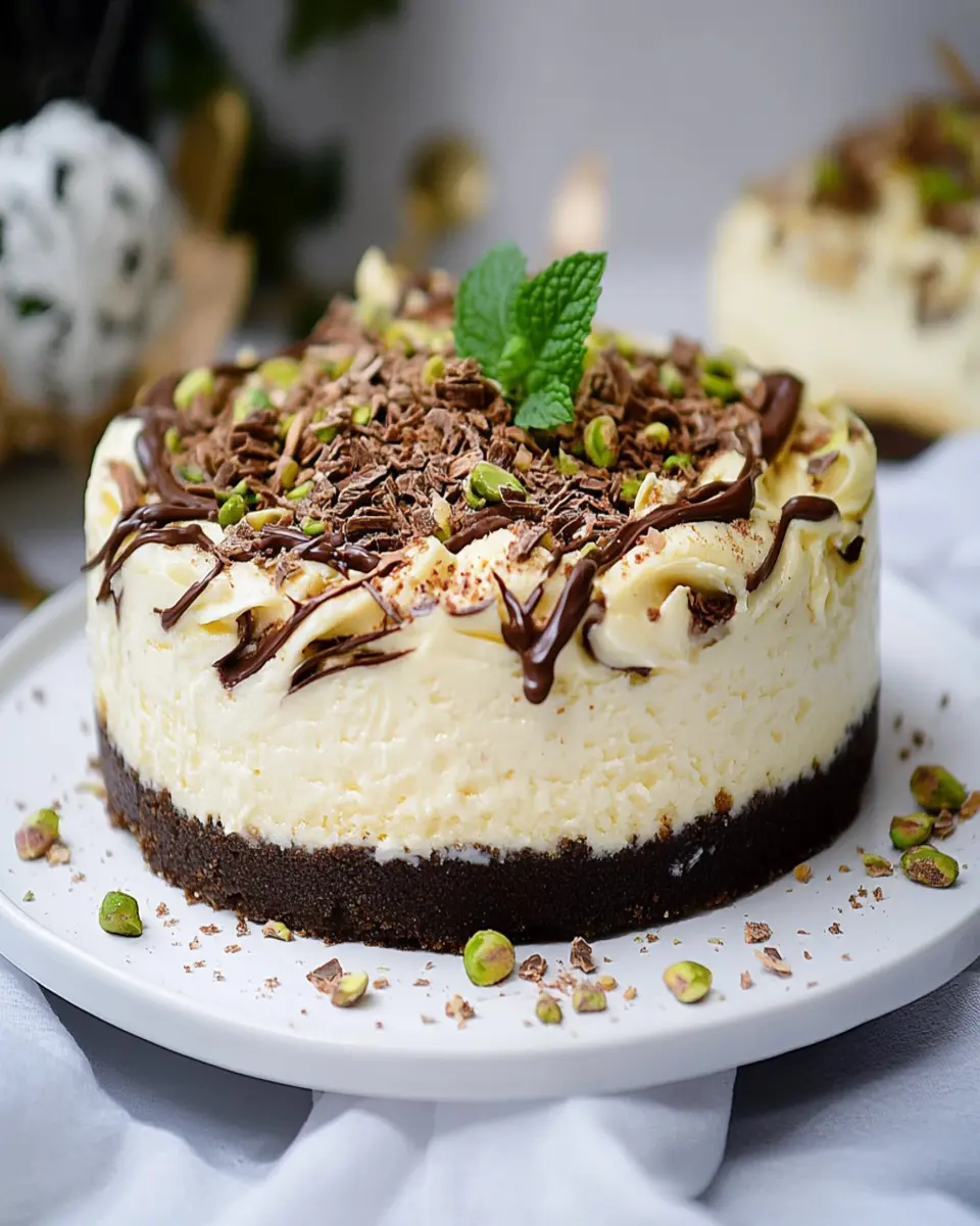 For an elegant presentation, slice the cheesecake into wedges and arrange them on a serving platter. Garnishing with extra chopped pistachios and a sprinkle of cocoa powder can enhance its visual appeal. You may also consider adding mint leaves for a pop of color and a hint of freshness.