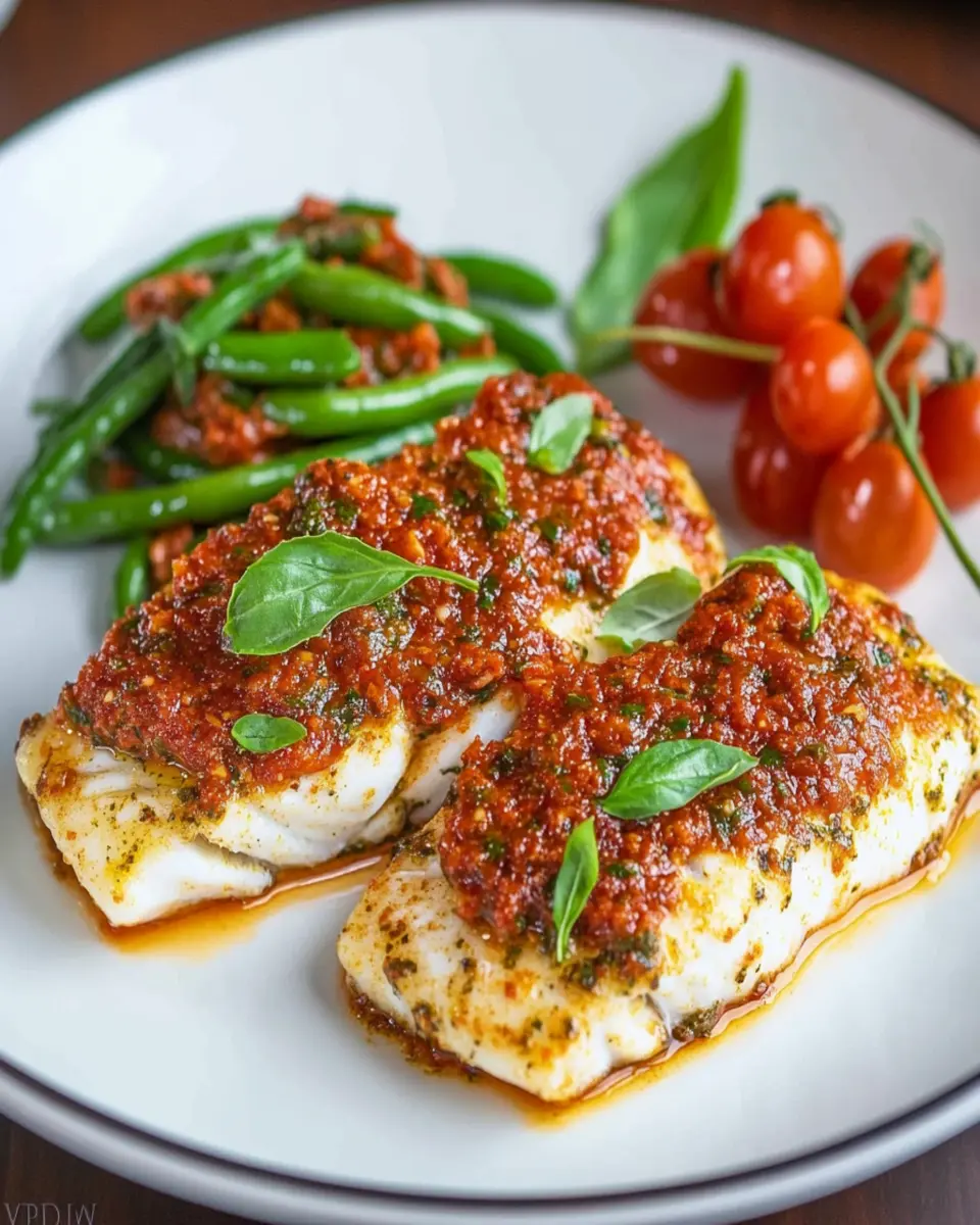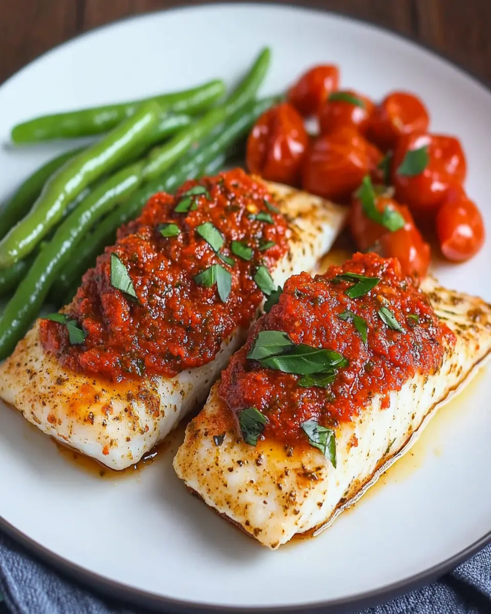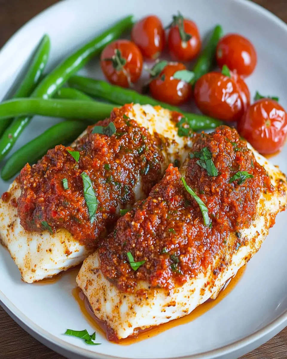 Red Pesto (1/2 cup): This flavorful sauce, made from sun-dried tomatoes, nuts, and aromatic herbs, adds a rich, tangy taste to the dish. Its bright red color not only enhances the visual appeal but also infuses the fish with robust flavors.