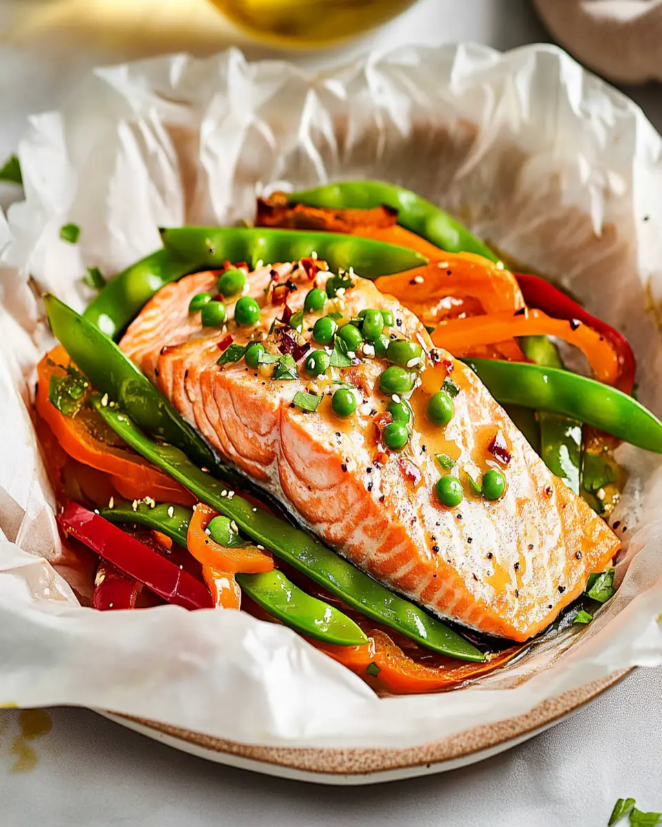 Salmon En Papillote is a cooking method where salmon fillets are wrapped in parchment paper with vegetables and seasonings, then baked. This technique steams the fish, keeping it moist and flavorful while infusing it with the aromas of the added ingredients.